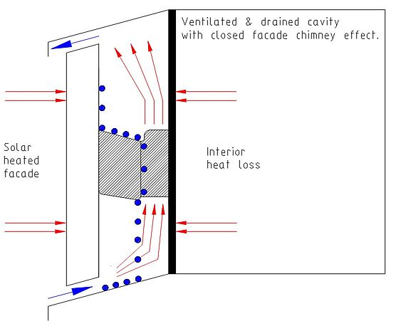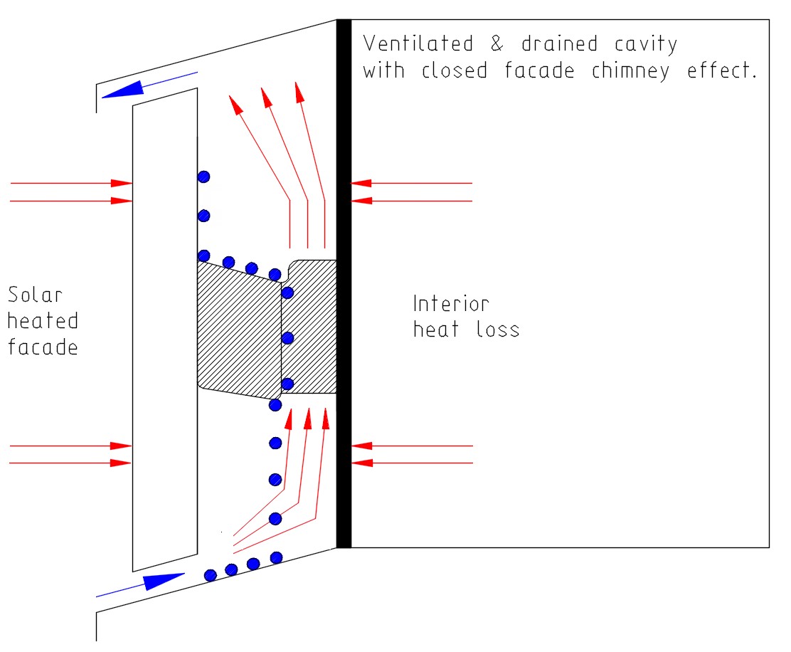 Er worden openingen voorzien aan de onder- en bovenkant van de gevelbekleding. Koude buitenlucht komt binnen via de onderkant van de spouw. Door de warmte in de spouw stijgt de lucht naar boven en verlaat deze het systeem via de bovenliggende openingen. Dit proces, vergelijkbaar met een schoorsteenwerking, wordt ook wel het “chimney effect” genoemd.